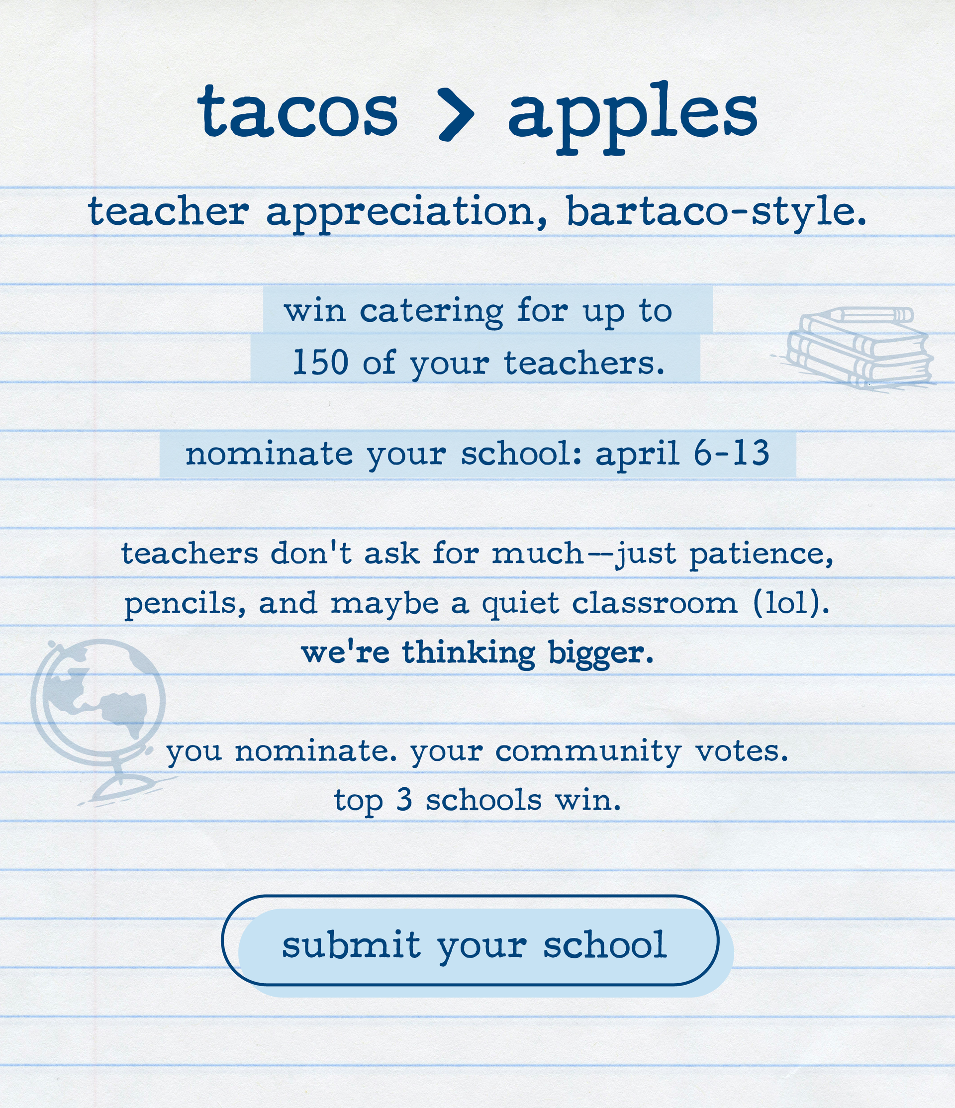 Celebrate Teacher Appreciation Week, bartaco-style. bartaco is inviting the community to nominate local schools for a chance to win a catered experience for their faculty and staff.