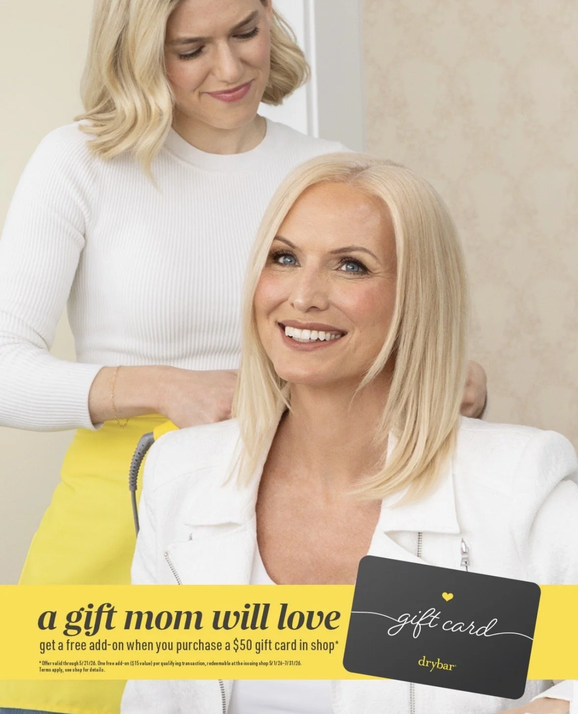 Drybar Vinings is offering a complimentary $15 add-on with the purchase of a $50+ gift card. Promo cards are redeemable May 1 through July 31.