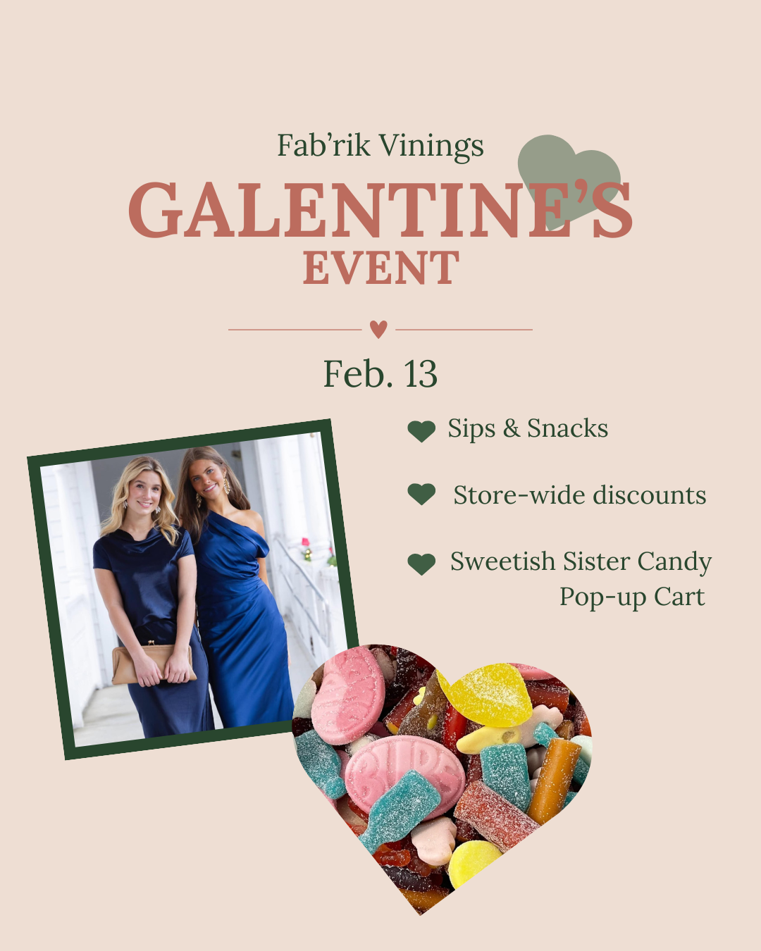 Celebrate Galentine’s Day at fab’rik Vinings with a special in-store shopping event featuring a storewide discount, Sweetish Sister candy cart pop-up, light bites, beverages, and a social giveaway.