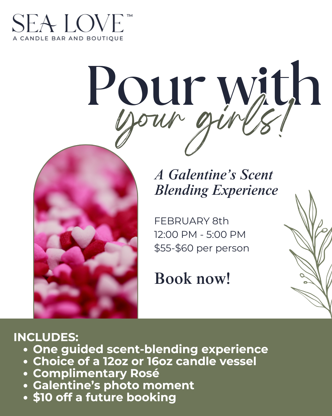 Gather your girlfriends for a Galentine’s scent-blending experience at Sea Love. Guests will enjoy a guided candle-making session, complimentary rosé, a professional photo moment, and $10 off a future visit. Choose from available time slots throughout the afternoon. Pricing ranges from $55–$60 per person. Advanced booking is recommended.