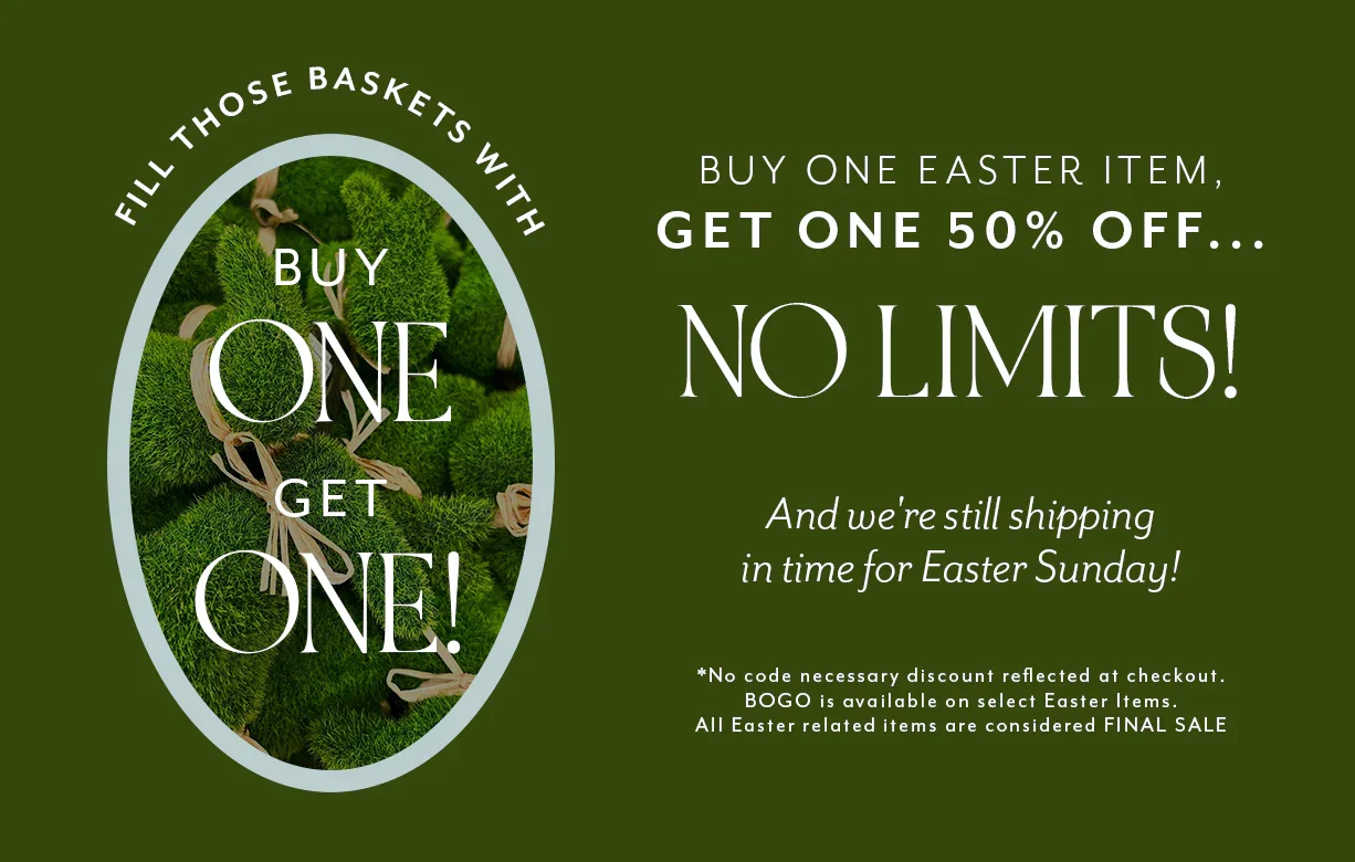 Easter BOGO event at Waiting on Martha Home Tuesday, March 31, 2026 6:30 PM Sunday, April 5, 2026 6:00 PM Google Calendar ICS Fill your Easter baskets with something special at Waiting on Martha Home. Enjoy a buy one Easter item, get one 50% off offer on a curated selection of seasonal décor, gifts, and basket essentials.